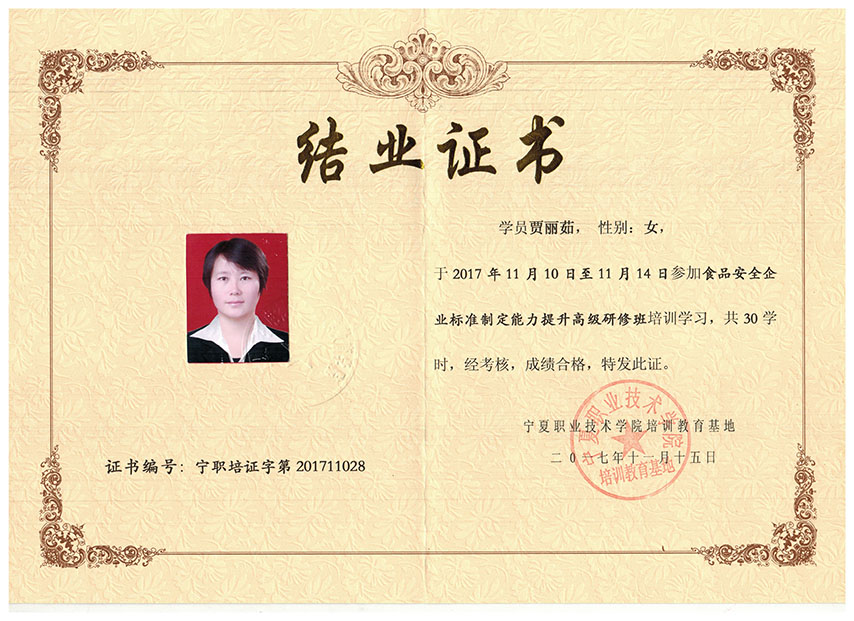 賈麗茹同志食品安全企業(yè)標(biāo)準(zhǔn)制定能力提升高級(jí)研修班結(jié)業(yè)證書