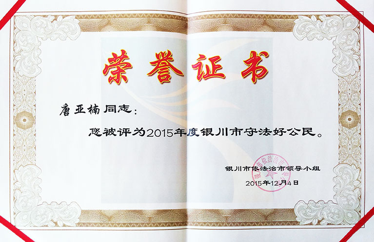2015年銀川市守法好公民證書