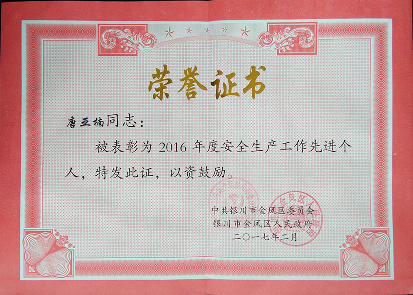 唐亞楠總經(jīng)理榮獲“2016年度安全生產(chǎn)工作先進個人”榮譽稱號