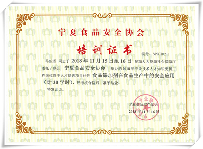 寧夏食品安全協(xié)會培訓(xùn)結(jié)業(yè)證書