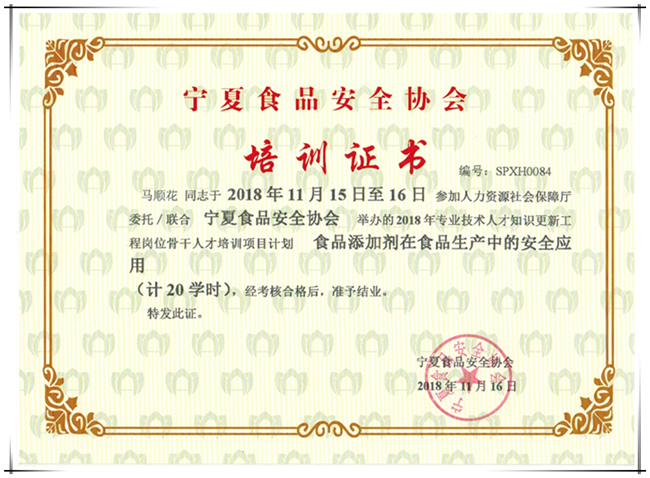 寧夏食品安全協(xié)會培訓(xùn)結(jié)業(yè)證書