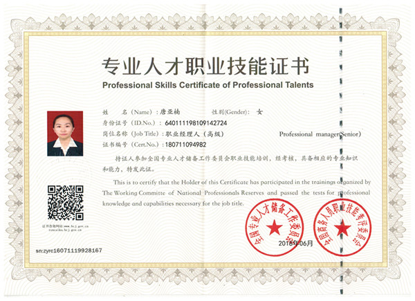 銀川伊百盛生物工程有限公司總裁唐亞楠榮獲“專業(yè)人才職業(yè)技能證書”