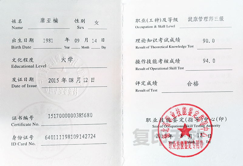 總經(jīng)理唐亞楠獲得健康管理師資格