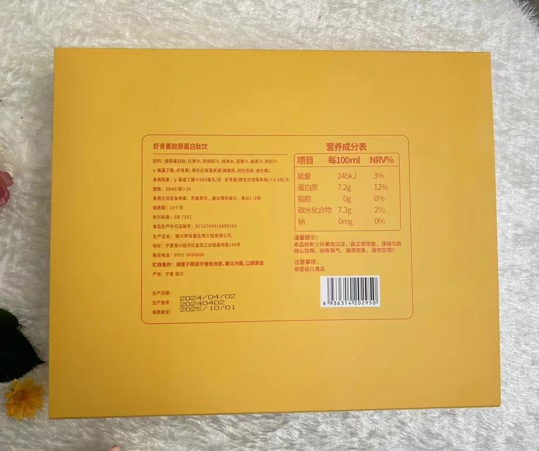 配料:膠原蛋白肽、紅棗汁、濃縮梨計、純凈水、藍莓汁、桑葚汁、枸杞汁、γ-氨基丁酸、蝦青素(雨生紅球藻來源)微囊粉、阿拉伯膠、維生素C